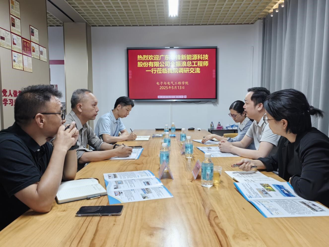 2025 年 5 月 13 日,广东华锋新能源科技股份有限公司铝箔事业部全振浪总工程师一行莅临太阳集团tyc9728,就有关合作项目开展调研交流。学院党委书记王浩发、院长陈庆华、副院长李云鹤等热情接待并参与交流。